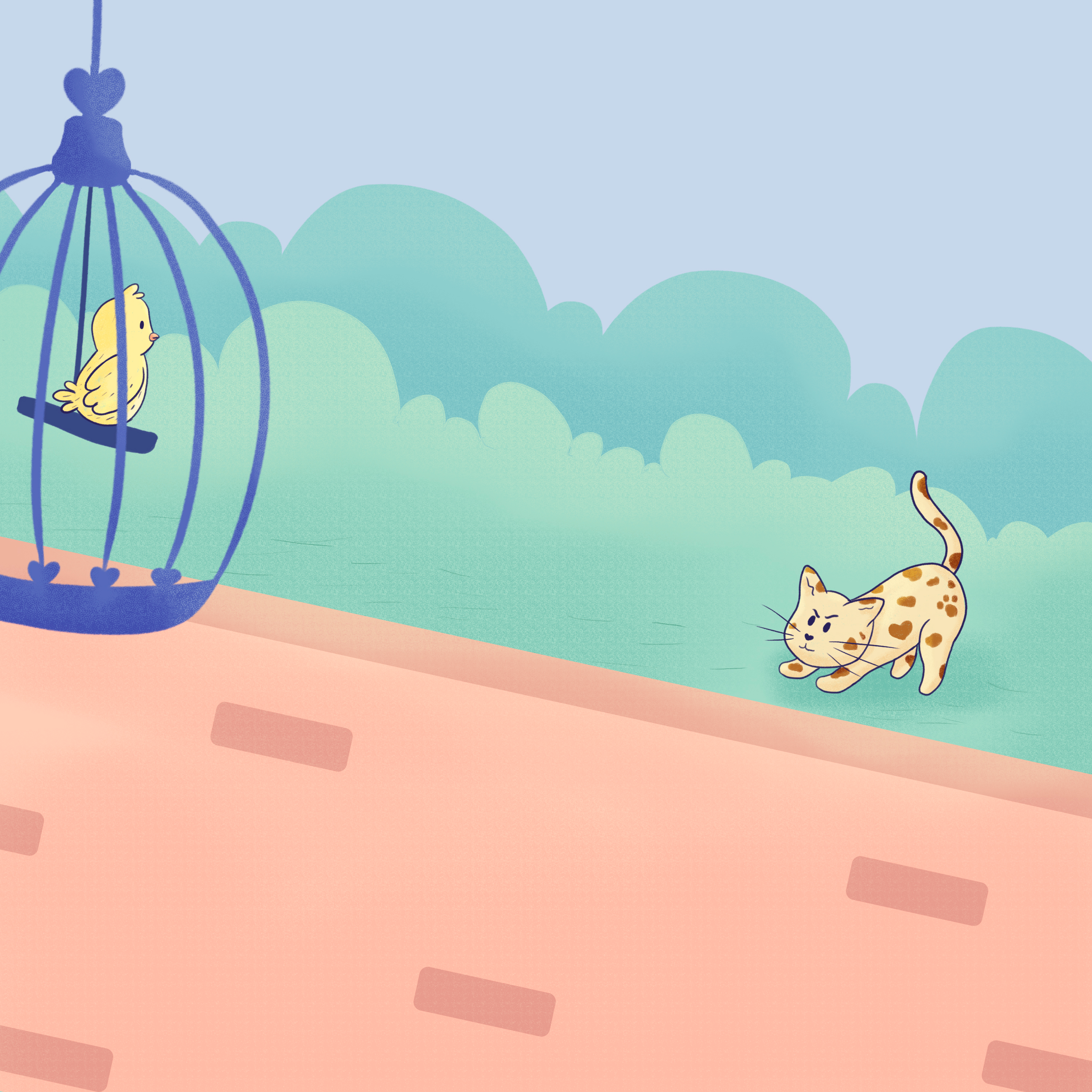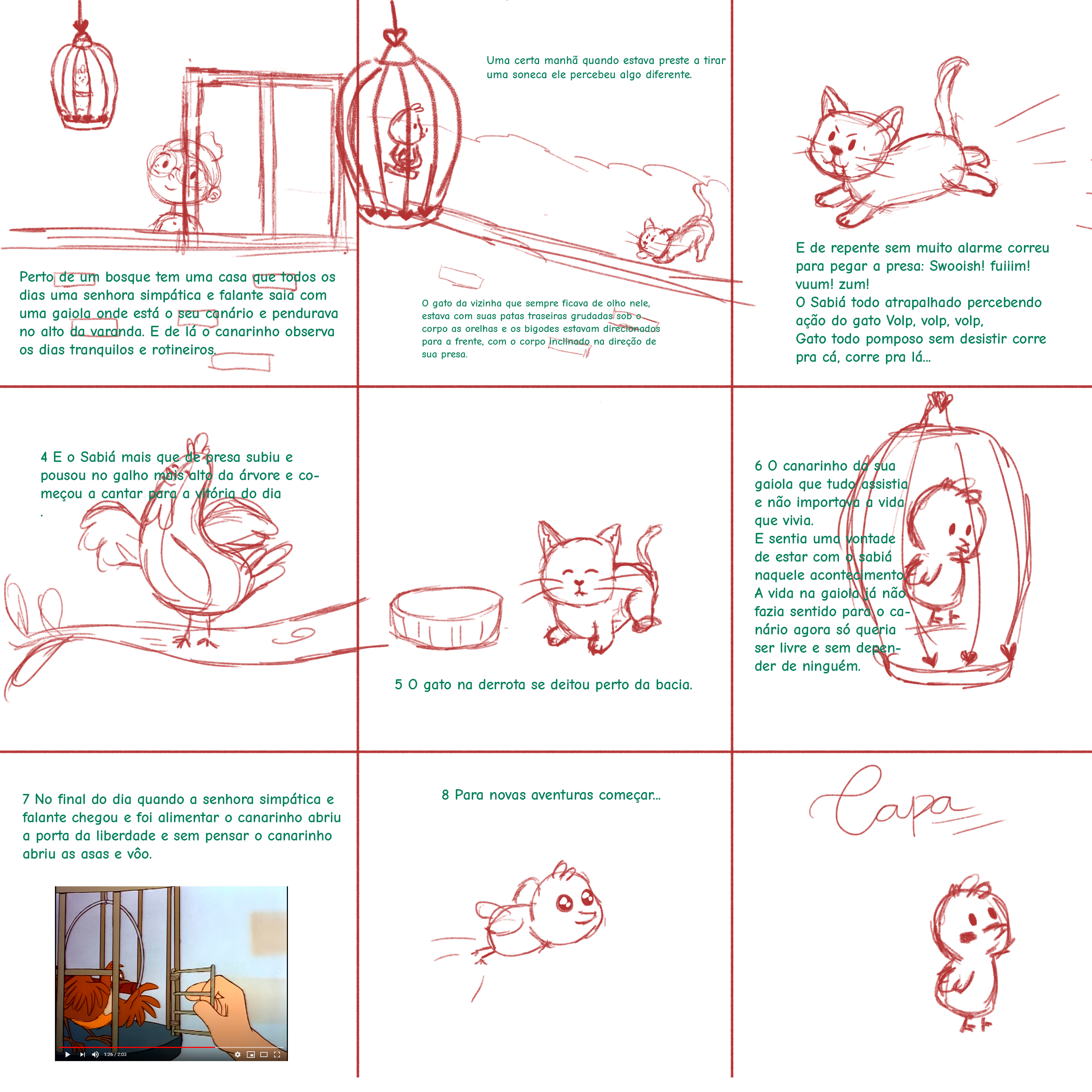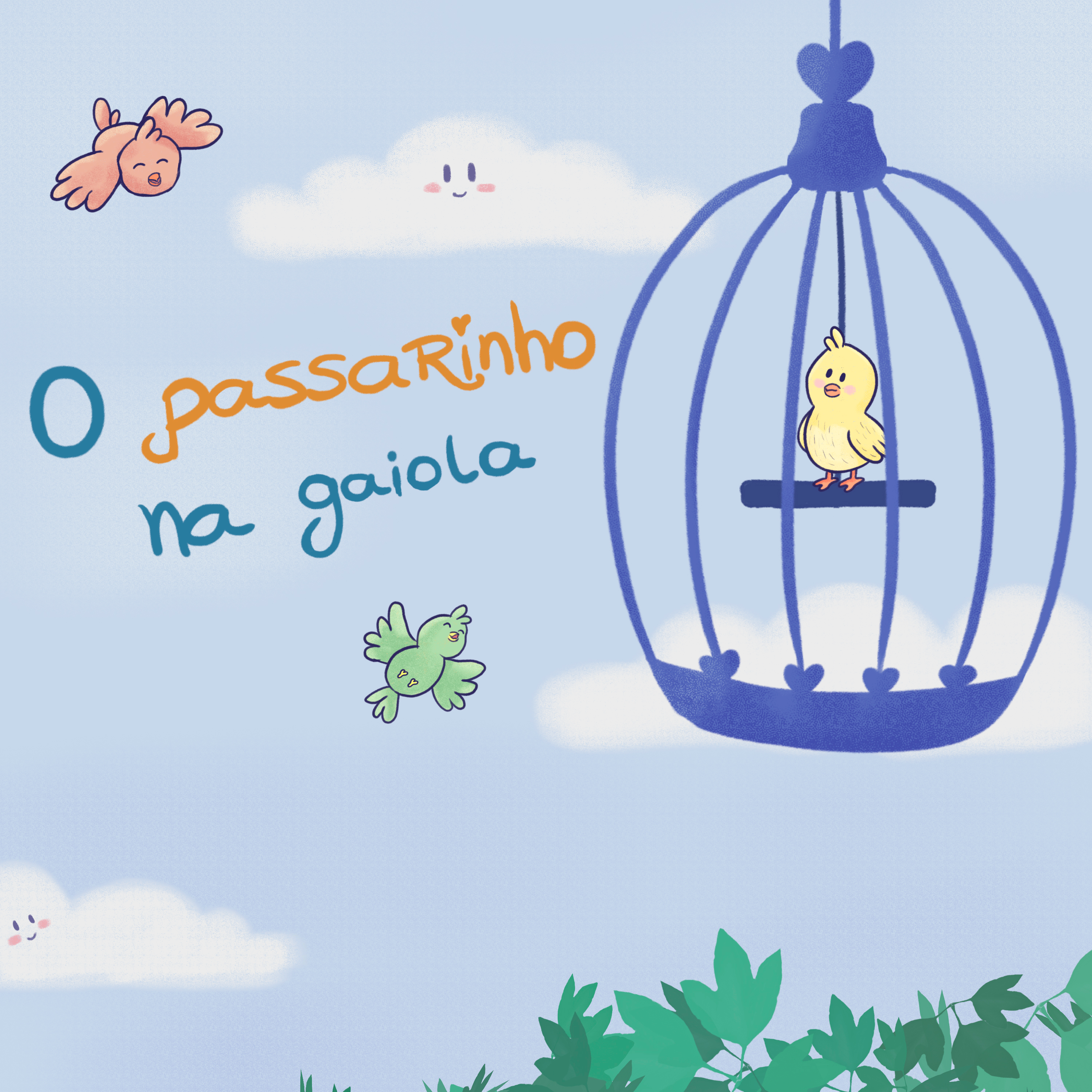 Illustrations from the book "O passarinho na gaiola" by the writer Juçara Oliveira. Published in 2020 by the publisher Historinhas pra Contar.
